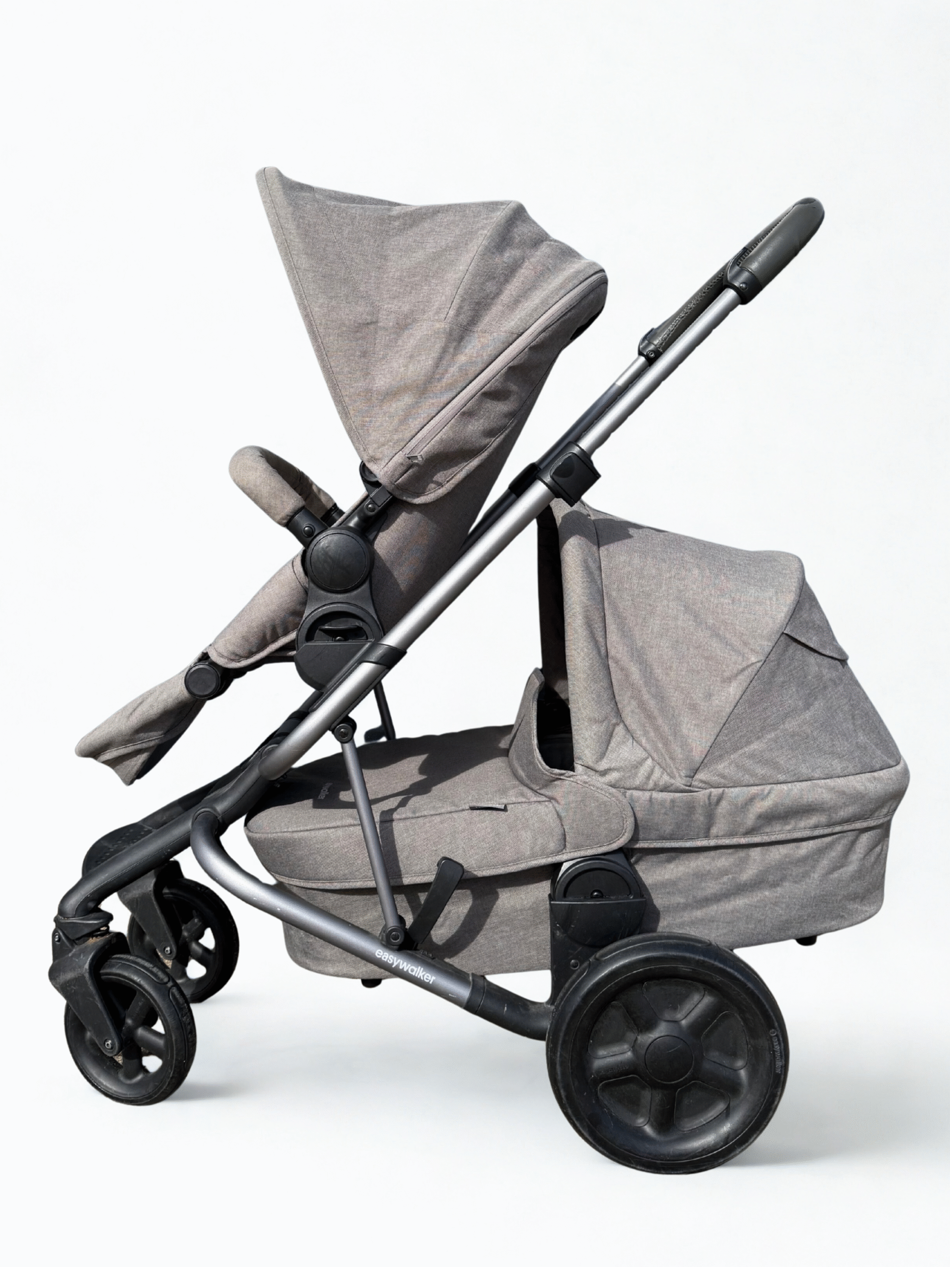 De Easywalker Harvey groeit mee met je gezin. Hij kan namelijk gemakkelijk worden uitgebreid tot duo kinderwagen, voor een broertje of zusje van je kleintje. Het uitbreiden kan door middel van de uitbreidingsset en een tweede zitje. Zo kan één kindje liggen in de reiswieg en je andere kindje kan in het zitje. Ideaal voor als er niet zoveel leeftijdsverschil zit tussen je kindjes, want zo kan je toch onbezorgd met beiden op pad!